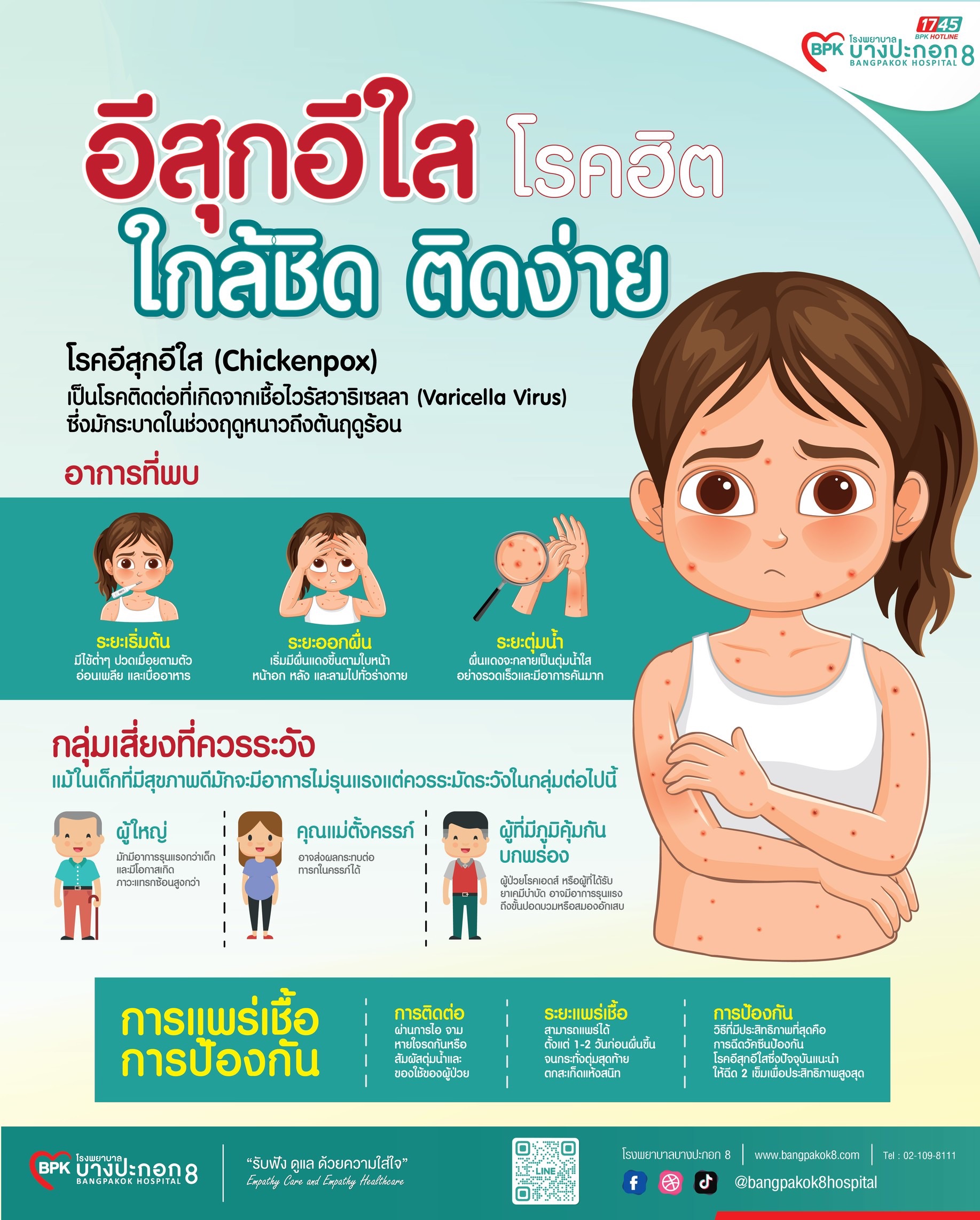 โดยระยะแพร่เชื้อ สามารถแพร่ได้ ตั้งแต่ 1-2 วันก่อนผื่นขึ้น จนกระทั่งตุ่มสุดท้าย ตกสะเก็ดแห้งสนิท