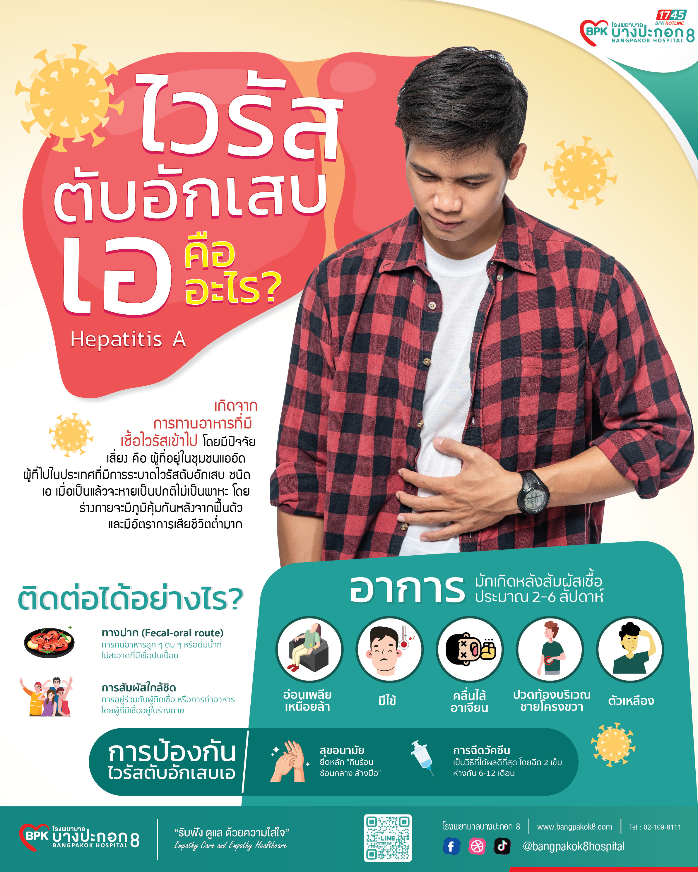 ไวรัสตับอักเสบเอ (Hepatitis A) คือ การอักเสบเฉียบพลันของตับจากเชื้อไวรัส HAVเกิดจากการทานอาหารที่มีเชื้อไวรัสเข้าไป โดยมีปัจจัยเสี่ยง คือ ผู้ที่อยู่ในชุมชนแออัด ผู้ที่ไปในประเทศที่มีการระบาดไวรัสตับอักเสบ ชนิดเอ สามารถติดเชื้อผ่านอาหาร / น้ำปนเปื้อนอุจจาระผู้ป่วย (Fecal-oral) อาการหลักคือไข้ อ่อนเพลีย ตัวเหลืองตาเหลือง ปวดท้อง มักหายได้เองภายใน 2 เดือน ไม่เป็นเรื้อรัง แต่ป้องกันได้ด้วยการฉีดวัคซีนและรักษาความสะอาด