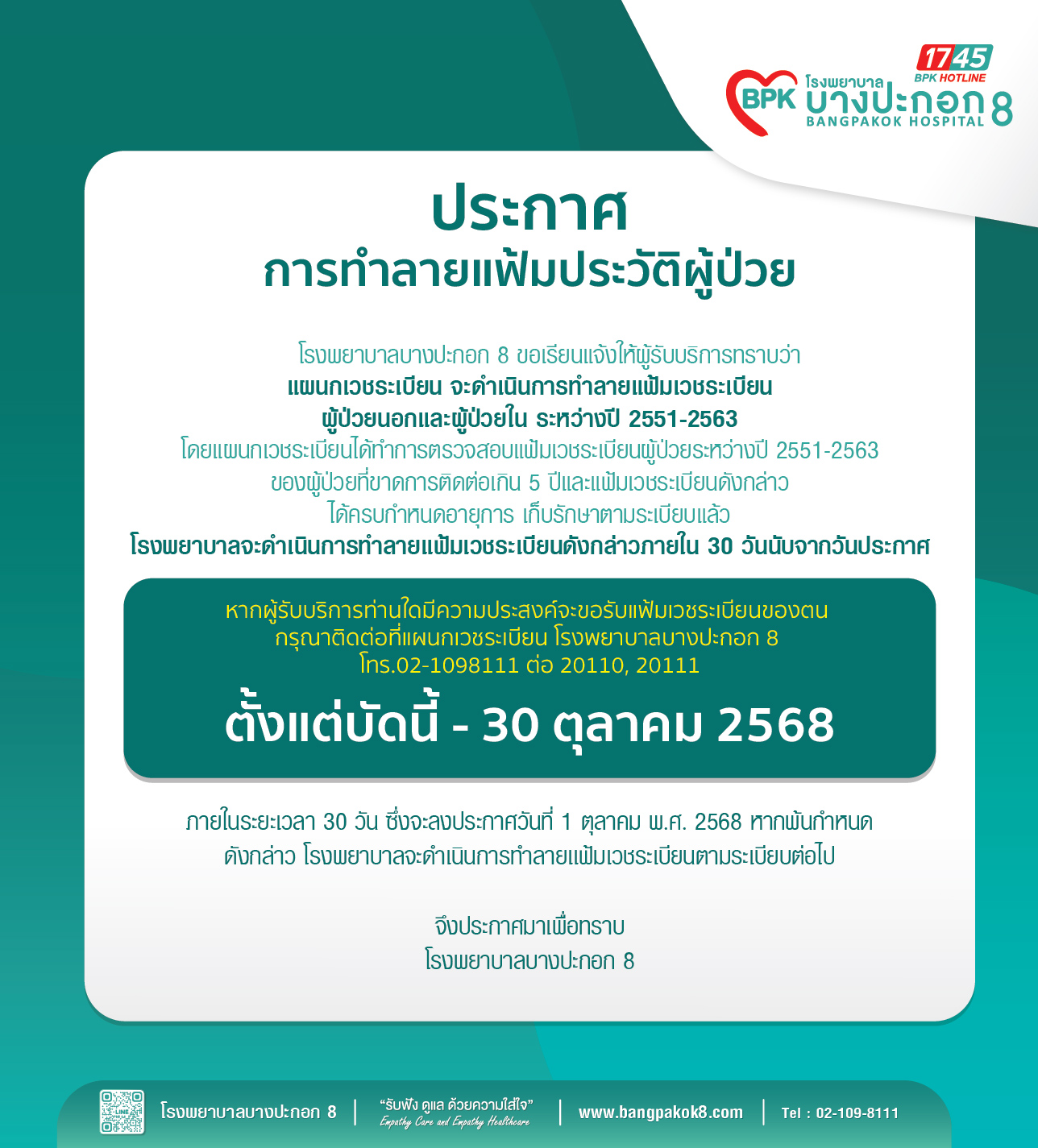 โรงพยาบาลบางปะกอก 8 ขอเรียนแจ้งให้ผู้รับบริการทราบว่า แผนกเวชระเบียน จะดำเนินการทำลายแฟ้มเวชระเบียนผู้ป่วยนอกและผู้ป่วยใน ระหว่างปี 2551-2563 โดยแผนกเวชระเบียนได้ทำการตรวจสอบแฟ้มเวชระเบียนผู้ป่วยระหว่างปี 2551-2563 ของผู้ป่วยที่ขาดการติดต่อเกิน 5 ปีและแฟ้มเวชระเบียนดังกล่าวได้ครบกำหนดอายุการ เก็บรักษาตามระเบียบแล้ว