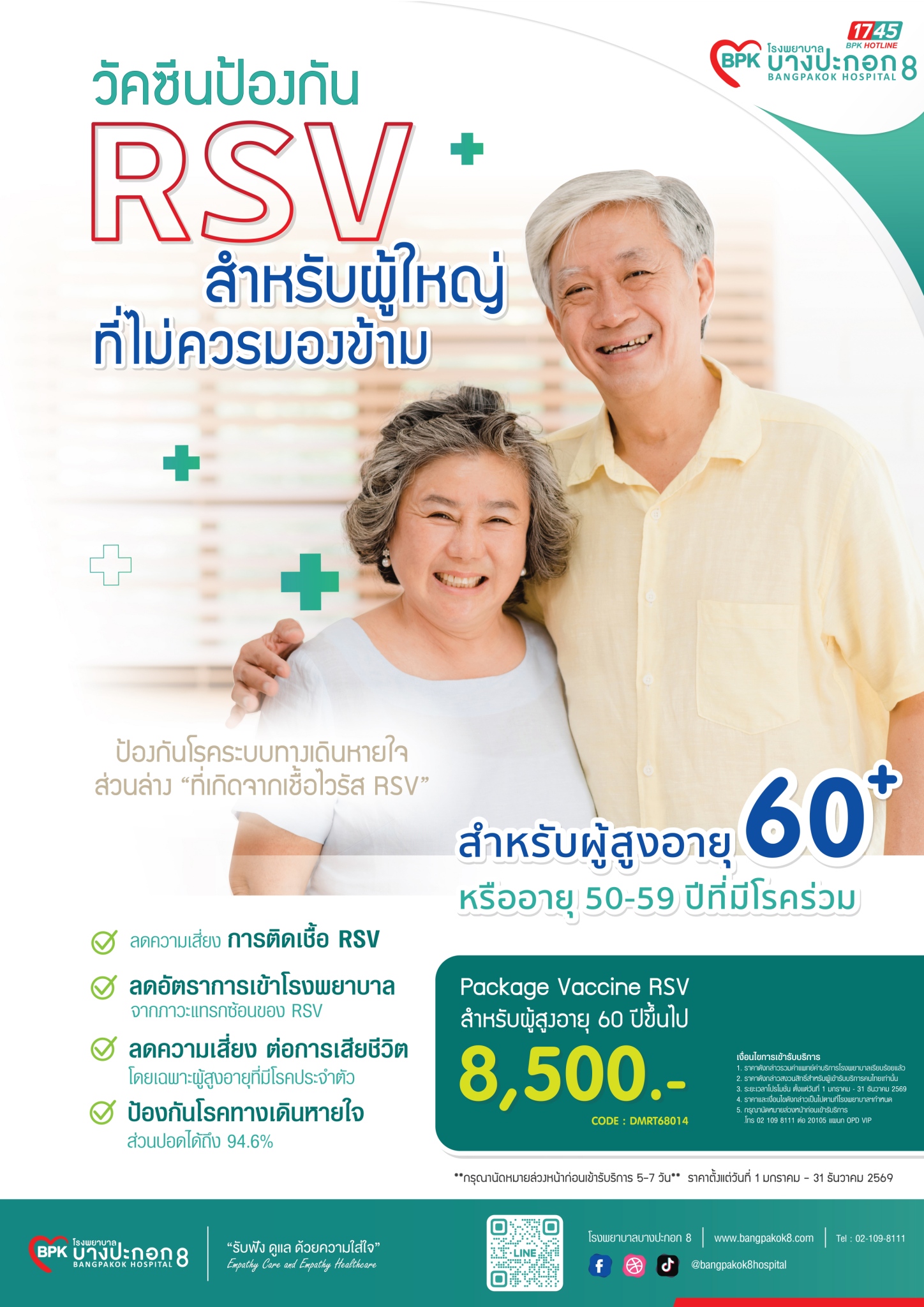 วัคซีน RSV สำหรับผู้ใหญ่ มีจุดประสงค์เพื่อป้องกันโรคระบบทางเดินหายใจส่วนล่างที่เกิดจากเชื้อไวรัส RSV โดย ผู้สูงอายุอายุ 60 ปีขึ้นไป และ ผู้มีอายุ 50-59 ปีที่มีโรคประจำตัว เช่น โรคหัวใจ โรคปอด โรคเบาหวาน โรคไต หรือภูมิคุ้มกันบกพร่อง ควรพิจารณาเข้ารับการฉีด