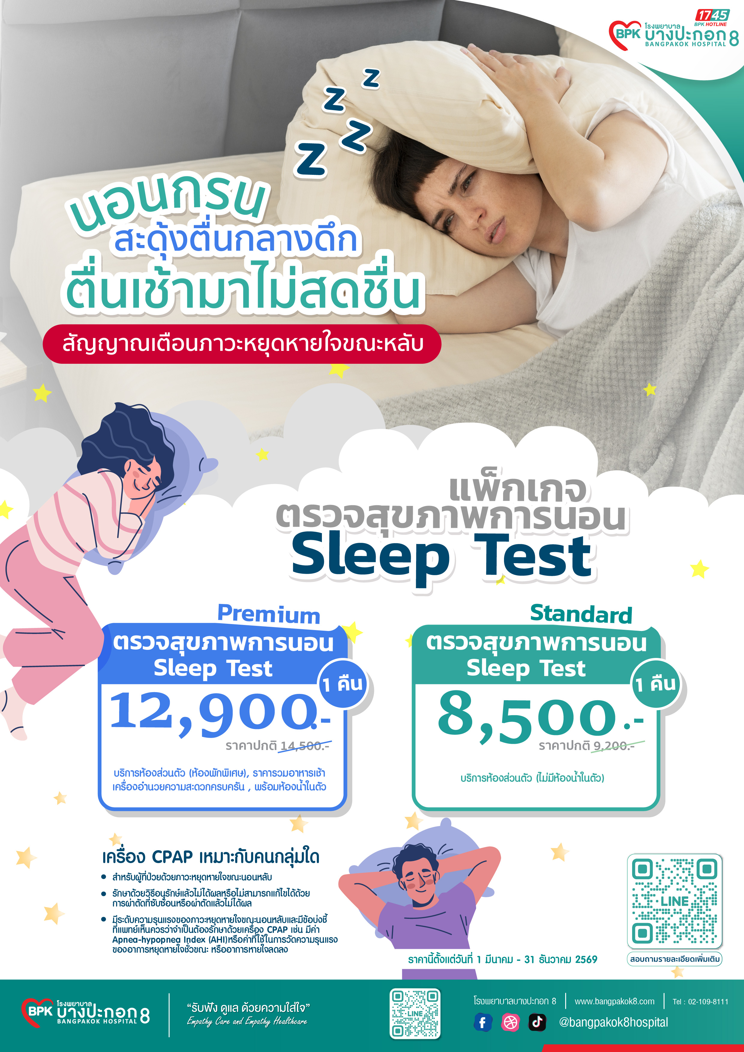 โรงพยาบาลบางปะกอก 8 เปิดให้ผู้ที่มีสิทธิประกันสังคมที่ โรงพยาบาลฯสามารถเข้ารับบริการคัดกรอง ตรวจ Sleep Test ได้โดยไม่มีค่าใช้จ่าย โดยการนัดหมายเพื่อเข้ารับบริการและประเมิณอาการเบื้องต้นที่ LineOA : @BPK8 >> https://lin.ee/kcwZbDV